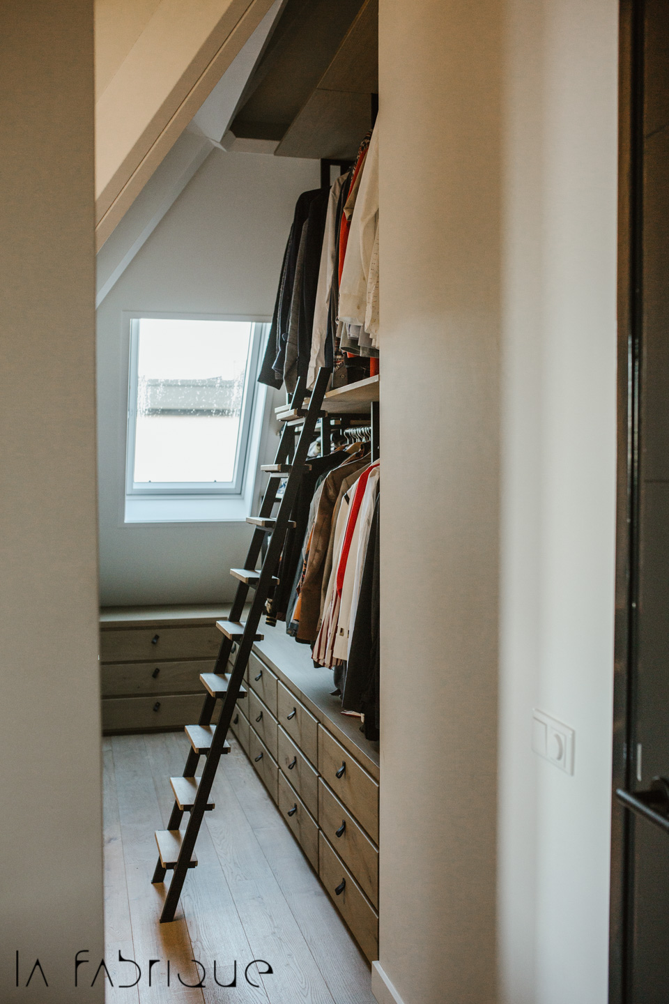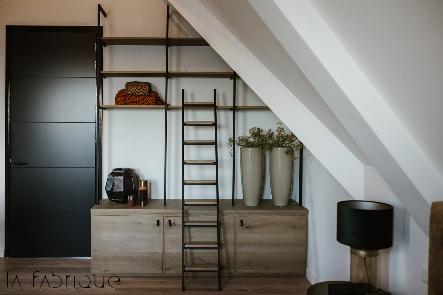 De ruimte waar de kledingkast is bedacht heeft een schuin dak waardoor het optisch klein lijkt. In het ontwerp hebben we hier dus rekening mee gehouden zodat het wel ruimtelijk voelt. We hebben gekozen voor stoere stompe lades met daarboven stalen planken en roeden. Het plafond is erg hoog maar met de bijpassende trap kun je makkelijk overal bij. Dezelfde kast komt terug in de slaapkamer voor extra opbergruimte en accessoires.