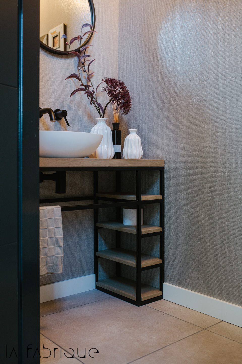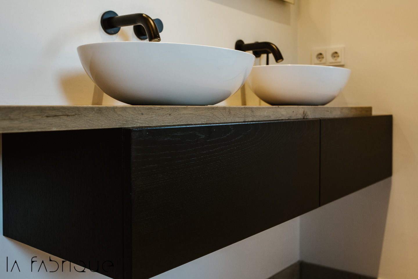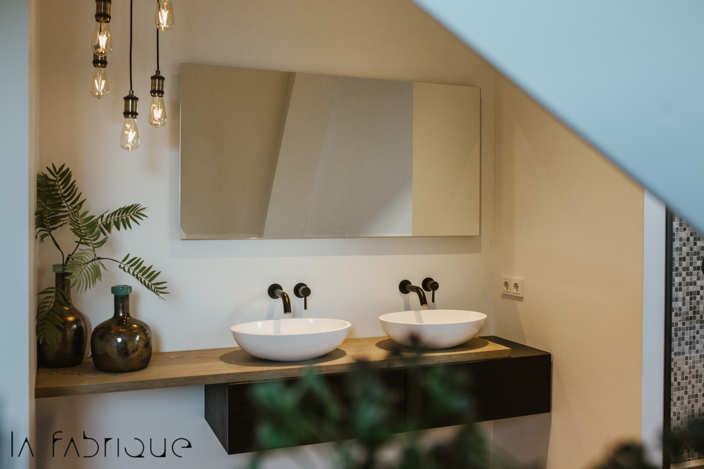 Ook het badmeubel past mooi bij de rest van het interieur. Een plank van blank eiken, lades in zwart gebeitst eiken. Een stoer en stijlvol resultaat in een woning die echt eenheid uitstraalt!
