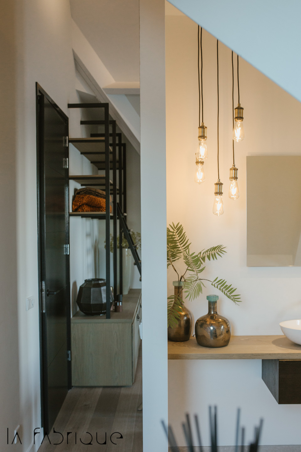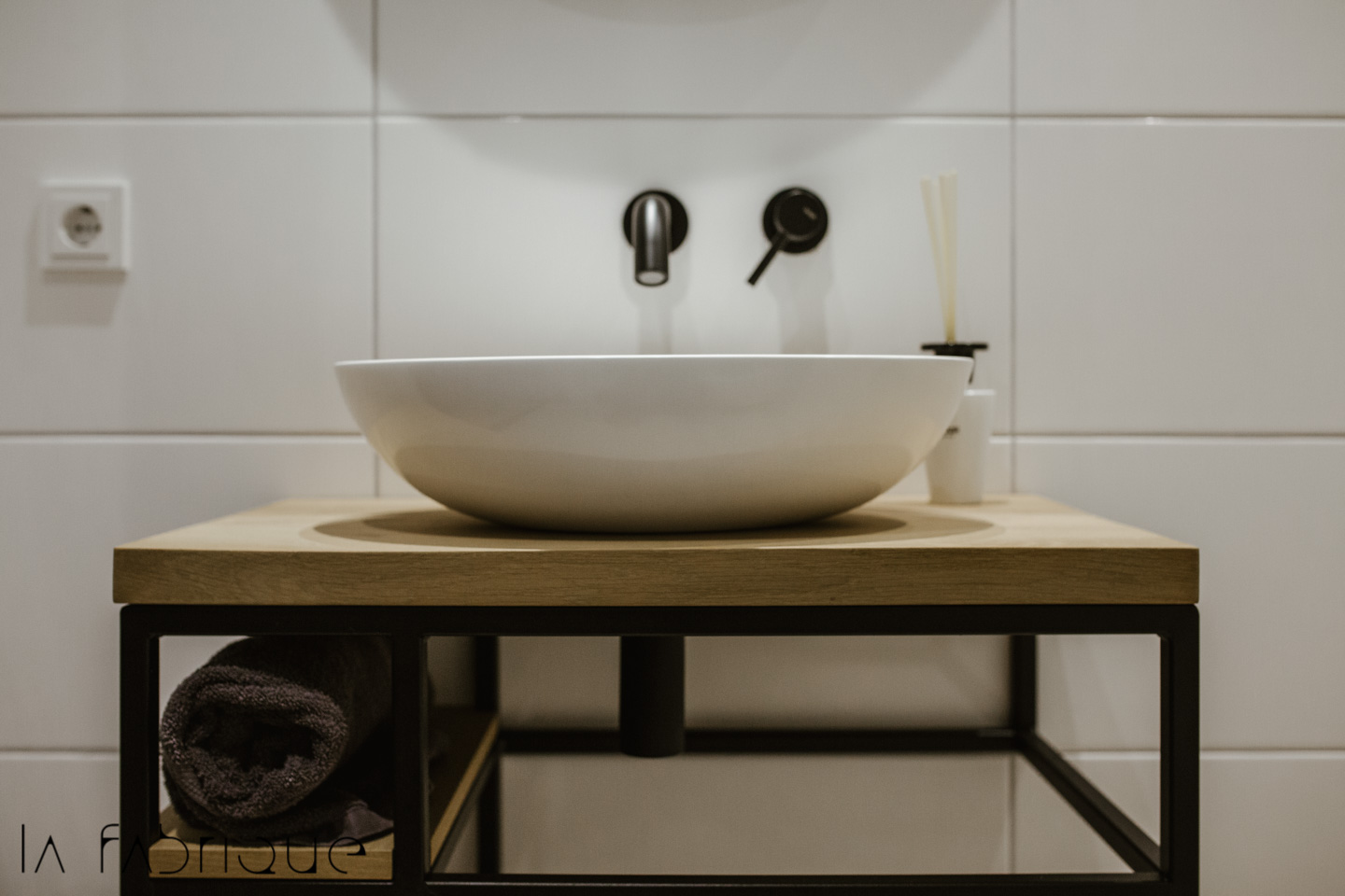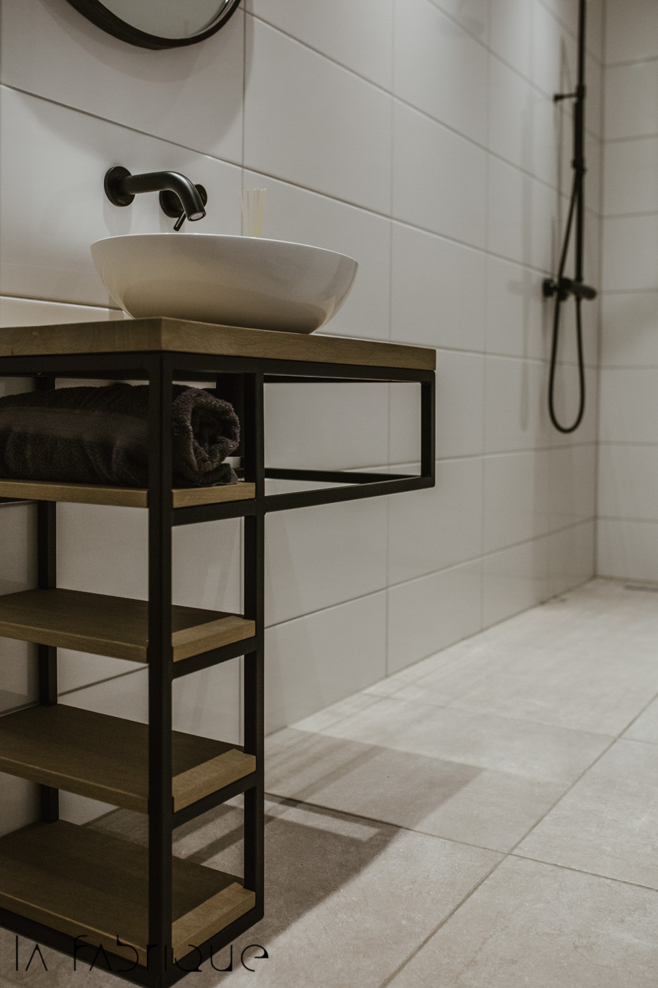 Ook het badmeubel past mooi bij de rest van het interieur. Een plank van blank eiken, lades in zwart gebeitst eiken. Een stoer en stijlvol resultaat in een woning die echt eenheid uitstraalt!