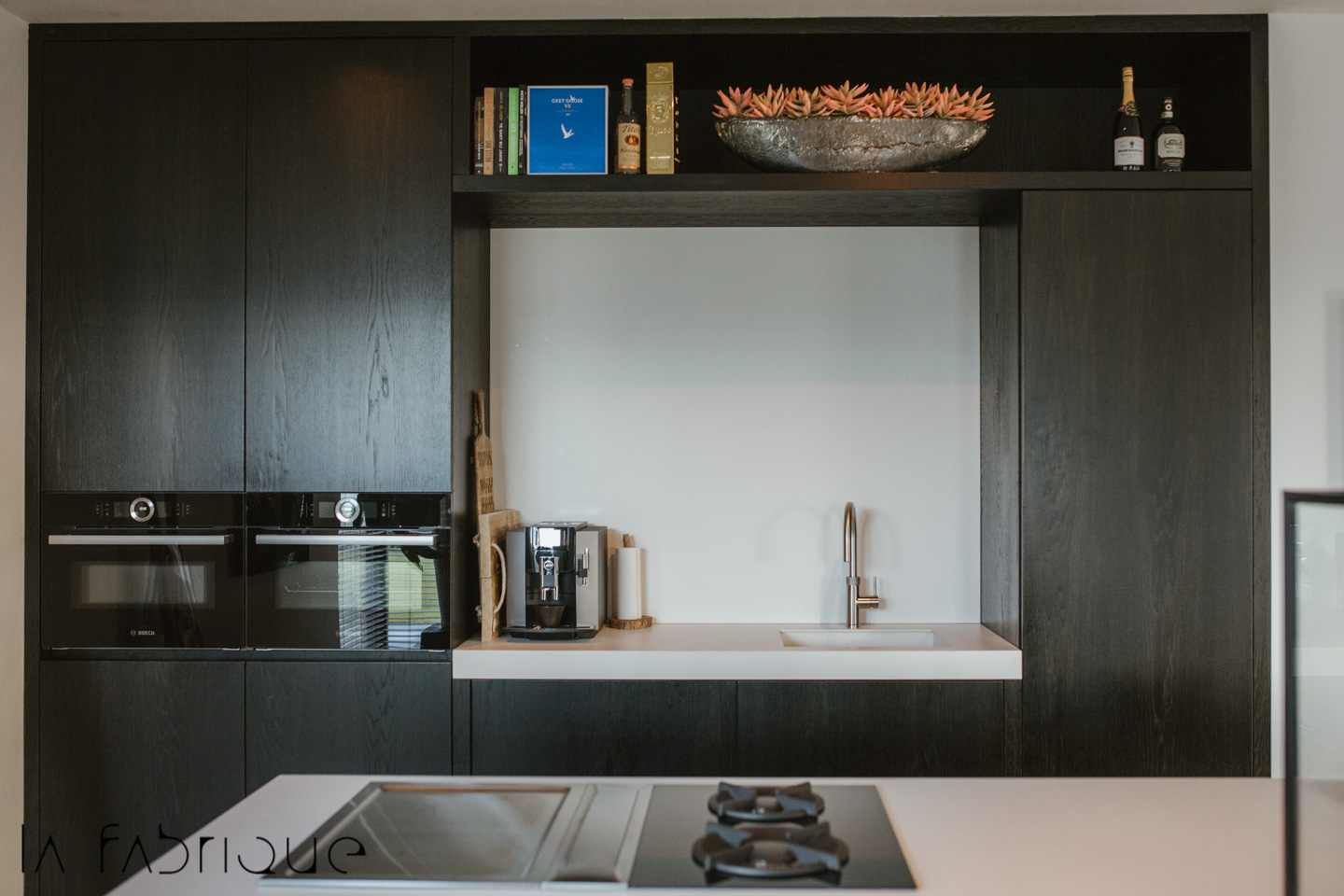 Onze opdrachtgever is een echte horeca liefhebber dus de keuken is van alle gemakken voorzien zoals een wijnkoeler, push to open vaatwasser, stoomoven/oven en een Bora professional kookplaat met afzuiging in het blad zodat er geen afzuigkap meer nodig is. Bovenal moest de keuken sfeervol zijn én heel belangrijk, een houten bar hebben. Volgens een echte horeca liefhebber gaat er niets boven het geluid van glaswerk op een houten bar!