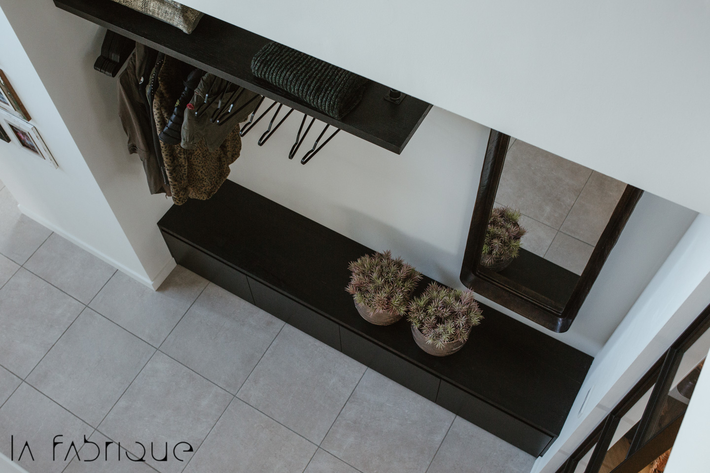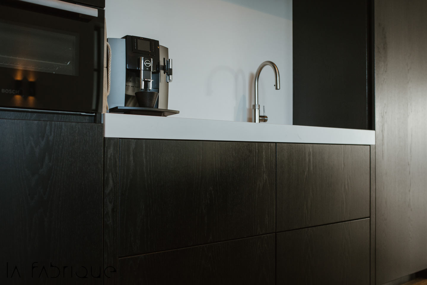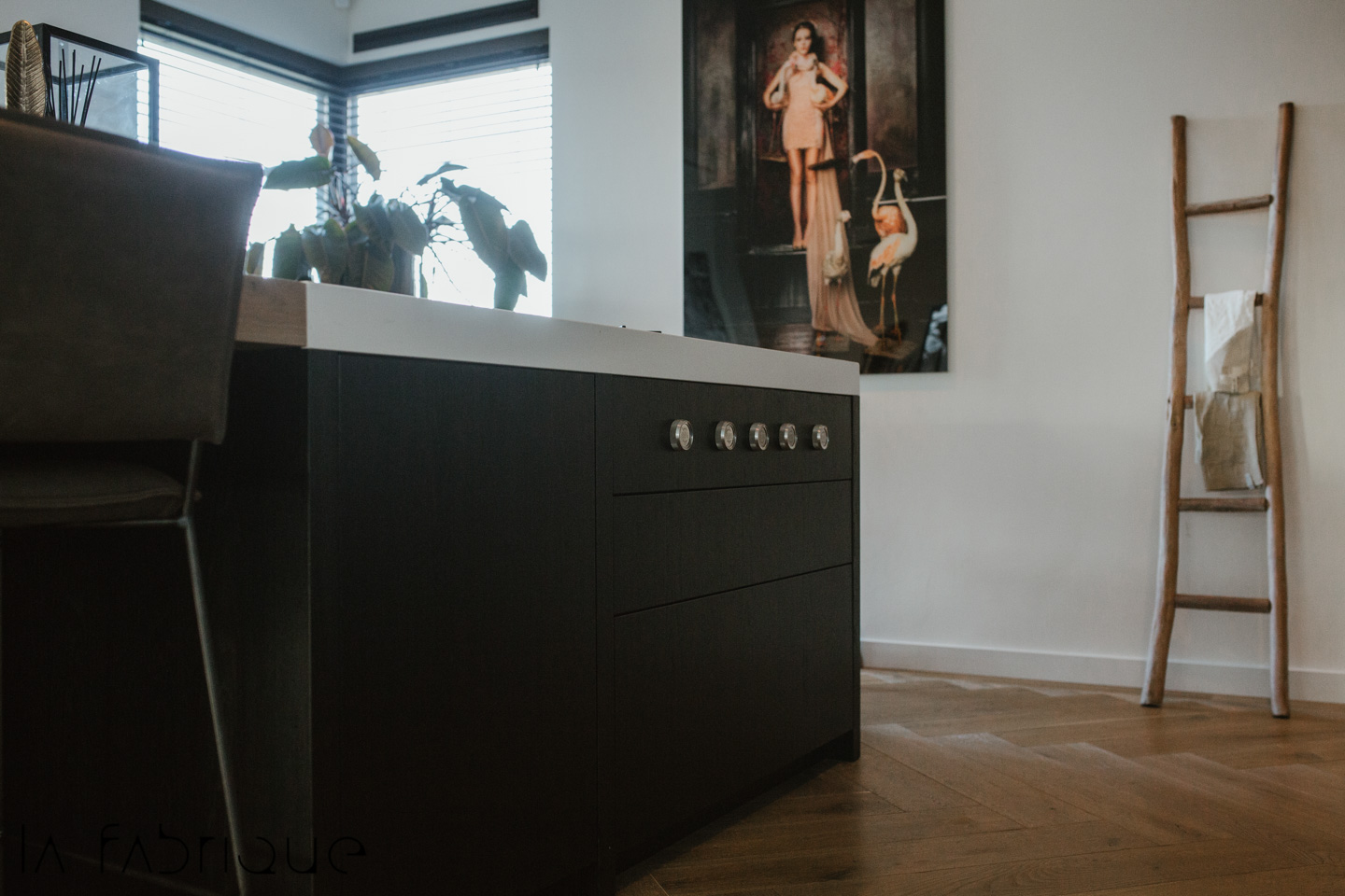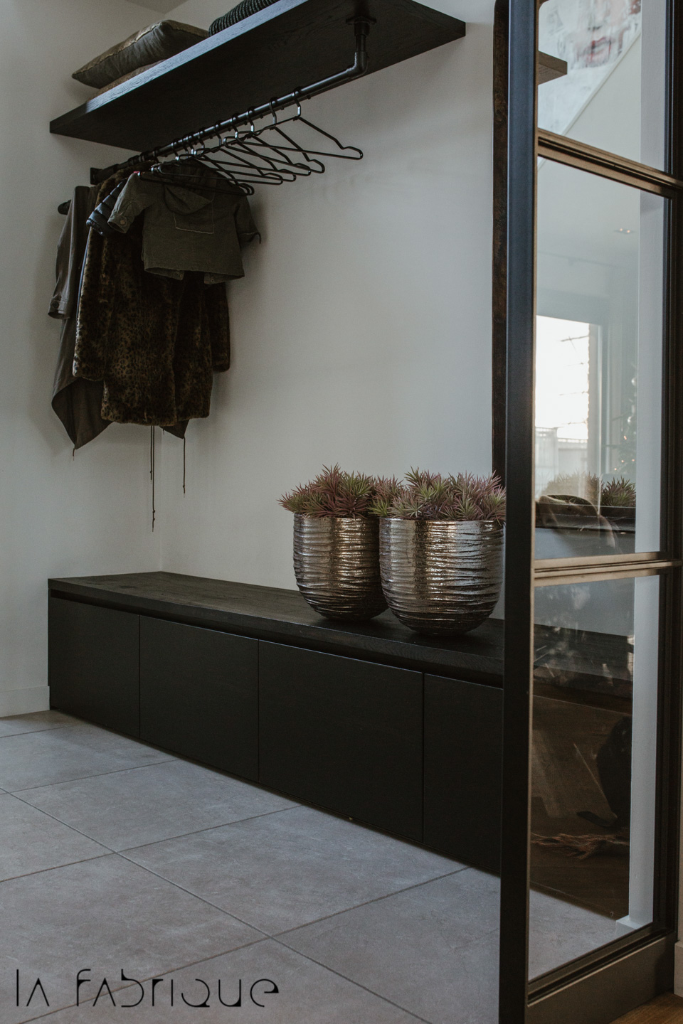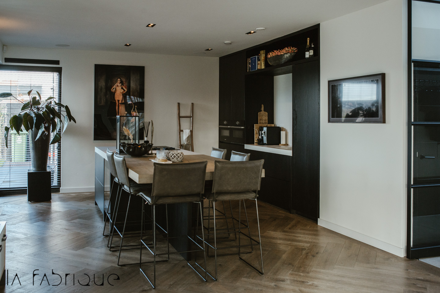 Donkere materialen en een stoere uitstraling passend bij de uitstraling van het huis, daar zijn we mee aan de slag gegaan. Wij hebben gekozen om te werken met eiken voorzien van een zwarte beits voor de keuken en het garderobemeubel in de gang. Het toevoegen van zwart gecoat staal met een subtiele dikte heeft buiten de stoere uitstraling gezorgd voor strakke lijnen.